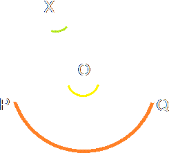 Take a look at the diagram on the right. You can see a circle with the centre point marked as O. As a general rule, when you need to label the points on or in a circle, the centre point is always marked O. There is an arc of the circle (a piece of the circumference) marked PQ in orange. It's the minor arc (which means we take the short way round from P to Q, not the long way), but the same theorem applies to the major arc (over the top of the circle, in this case) as we will see later.