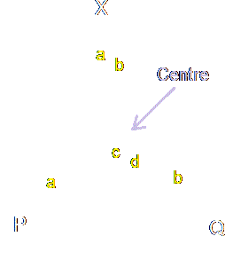 Take a look at the diagram on the right. I would normally mark the centre as O, but it's a little crowded at the centre of that picture, so just assume that the point indicated by the arrow is the centre of the circle and that I've labelled it O.