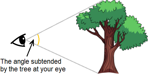 In circle theorems, you'll meet this word subtended quite a lot. It refers to an angle that is formed by its relation to a line. Take a look at that tree on the left. Someone looks at the top of the tree, then rotates his eyeball down to look at the bottom. The angle that is formed is subtended by the tree. In general, any line (curved, straight or wiggly) subtends an angle at some distant point (not on the line). You start at one end of the line, move directly towards the point and "bounce off" it directly to the other end of the line.
